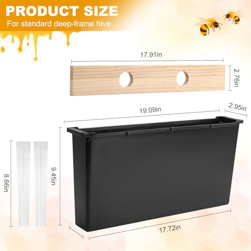 Size and package: The Dimension of this bee feeders for hives is 19.09″x 2.95″x 9.45(L x W x H). The bee feeders for hives will occupy the position of 1-2 frames in the deep beehive box, 2PCS/box Large bee feeder