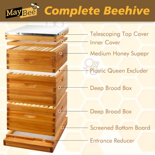 MayBee Hives 10 Frame Screened Bottom Board Beehive Dipped in 100% Beeswax, Bee Hives Kit Includes 2 Deep Boxes & 1 Medium box with Beehive Frames and Heavy Wax Coated Foundations.Preferred for summer.