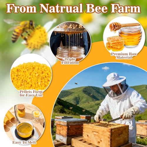 Product Essentials: Package contains 430g (0.95lb) of premium yellow beeswax pellets. Made purely from high-quality bees wax, free from paraffin, soy, or palm wax. Their natural yellow hue and sweet honey aroma come from included bee pollen and propolis