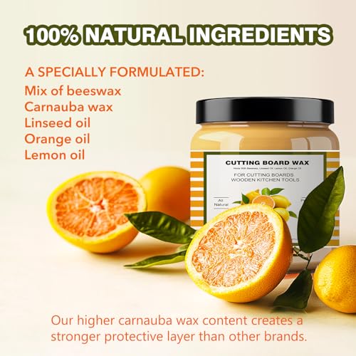 PREMIUM NATURAL INGREDIENTS: Our cutting board wood wax blends of beeswax, carnauba wax, flaxseed oil, and lemon oil are natural ingredients. The natural ingredients help to maintain the wood’s moisture, preventing cracks and splits while enhancing its natural beauty. You’ll never have to second-guess the safety of your kitchen essentials again.