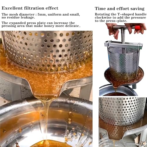 Easy to operate: 1.Put beeswax into the fliter bag. 2.Put the nylon bag into Honey press machine. 3.Rotate the T-shaped handle clockwise to apply pressure to the pressing-plate. 4.Squeeze beeswax.Save time and effort, easy to use.