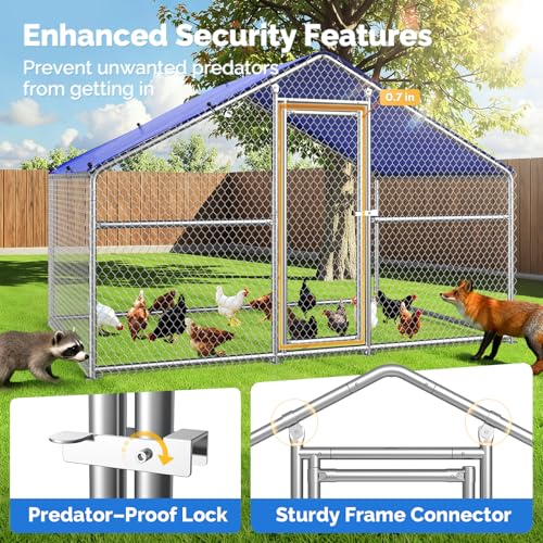 【Safety Accessories & Easy Installation】Our chicken pen is equipped with a reinforced, widened door lock and narrow door gaps to keep predators out and your flock safely inside. For easy setup, the spring-plunger pipe connections allow for quick assembly, guided by a clear, step-by-step manual. To further ensure stability, 14 ground stakes are included to anchor the structure firmly, built to withstand strong winds and heavy rain