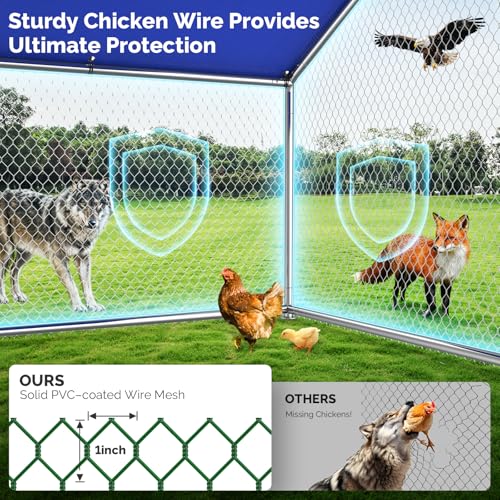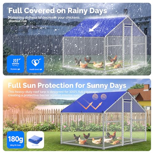 【Durable & Removable Full Coverage Cover】This versatile chicken run comes with PE cover that snap on and off effortlessly. In rainy or snowy days, simply attach all covers to achieve full coverage, keeping your chickens dry and sheltered without sacrificing their roaming space. On sunny days, you can remove it for ventilation.The waterproof, UV‑resistant fabric maintains optimal interior temperatures in the chicken coop promoting healthy, stress‑free chickens