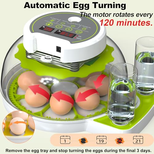 【Automatic Egg Turning】The egg incubator automatically turns the eggs every 120 minutes to prevent the shell and egg membrane from sticking and increase your hatching rate. Take out the egg tray in the last 3 days to stop turning eggs.