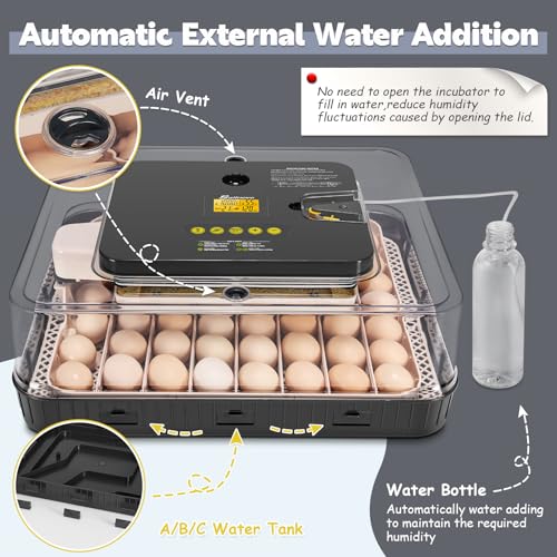 【Stable Temperature & Auto-Humidification】Advanced heating technology and a powerful motor-driven fan ensure consistent temperature and humidity. External water addition and automatic humidification, minimizing temperature fluctuations from lid opening. Features include auto temperature and auto-humidification, automatic egg turning, alarm system, and LED lighting.