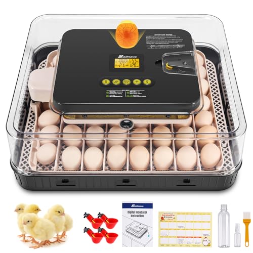 【Large 56-Egg Capacity】The Sailnovo Intelligence Egg Incubator offers efficient hatching with uniform temperature control, precise humidity display, and automatic humidification technology. Adjustable egg trays and a spacious brooding area make it perfect for hatching poultry eggs, including chicken, duck, goose, quail, pigeon, and turkey eggs. Dimensions: 18.7″ x 16.1″ x 6.3″.