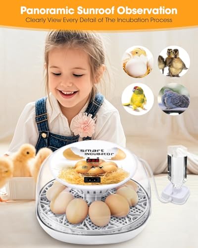 Incubators for Hatching Eggs, Chicken Waterer Cups, Automatic Egg Turner Holds 12 Eggs, Smart Incubator 360° Clear Window with Temperature Display Egg Candler for Small Poultry Chickens Ducks Quails