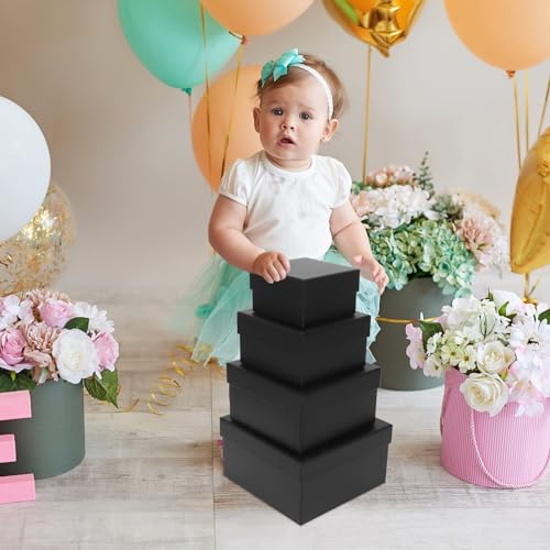 4 Pack Large Nesting Gift Boxes with Lids, 3.7″-6.4″ Assorted Sizes Black Square Gift Box for Presents, Stackable Boxes for Birthday Wedding Christmas Party Gift Wrapping