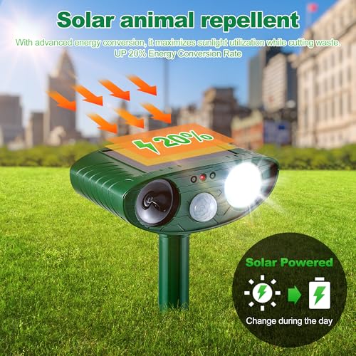 【Easy installation and use】For first-time setup, charge the solar panel in direct sunlight for 2 days. After assembly, place the deterrent in a sunny location (9-10 inches above ground) for best performance. Position it in areas where animals are commonly seen to enhance coverage.