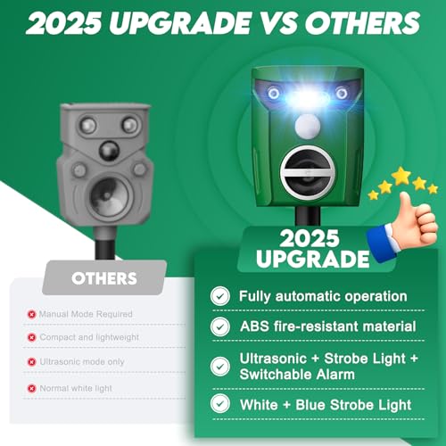 [Effective Protection]: Utilizing a combination of adjustable ultrasonic waves, intense flashing strobe lights, and optional alarm sounds, this deer repellent devices effectively disrupts the senses of deer, cats, dogs, raccoons, rabbits, skunks, and more. The varying frequencies prevent adaptation, ensuring long-term effectiveness.