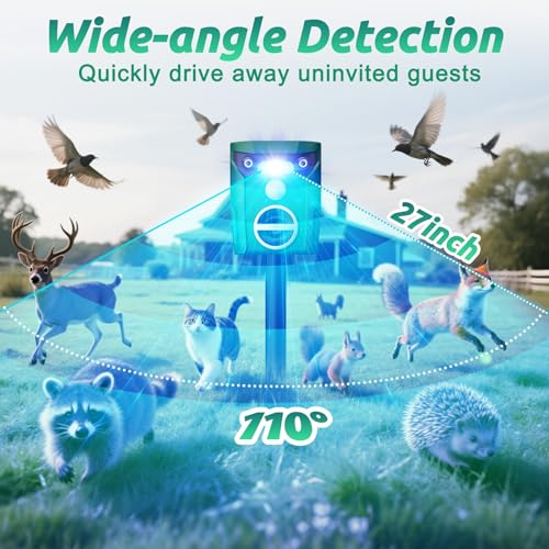 [Wide-Angle Detection & Broad Coverage]: Featuring a sensitive PIR motion sensor with a 27-foot detection range and 110° angle, the The ultrasonic animal repeller outdoor instantly responds to animal movement by activating ultrasonic sound, strobe lights, and optional alarms. Consistent use over 2–3 weeks establishes a lasting pest-free zone.