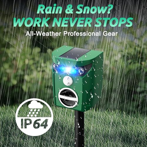 [Solar-Powered and Weatherproof]: Equipped with a high-efficiency solar panel for continuous charging, this animal repellent operates wirelessly and maintenance-free. Its IP64 waterproof rating guarantees reliable performance in various weather conditions, making it ideal for year-round use in gardens, yards, farms, and orchards.