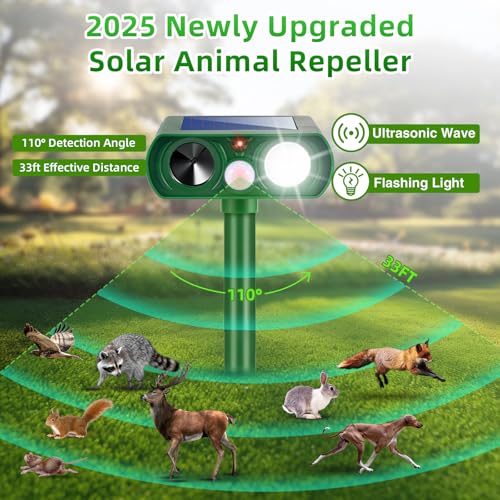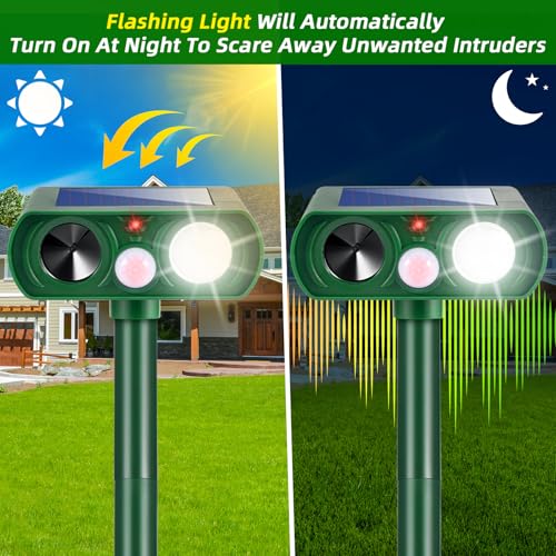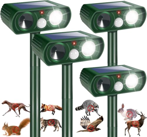 2026 New Deer Repellent Solar Ultrasonic Animal Repellent Outdoor Motion Activated Cat Deterrent with Flash Light to Keep Rodent Dog Skunk Rabbit Raccoon Squirrel Out of Yard Garden Lawn,4Pack