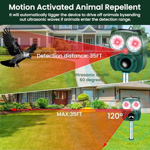 Wide Coverage: The ultrasonic animal repeller outdoor can detect movement within a 120°angle and a range of 35 feet, keep unwanted animals at bay, ensuring a peaceful and clean outdoor environment
