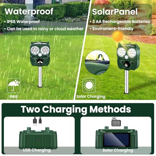 Solar Powered & Waterproof: This deer repellent device features a solar panel on the top, which can be charged by solar energy or via the included USB. Designed with an IP66 waterproof rating, it ensures reliable operation in rain, snow, and other harsh weather conditions. For the first using, please charge it in direct sunlight for 8-9 hours
