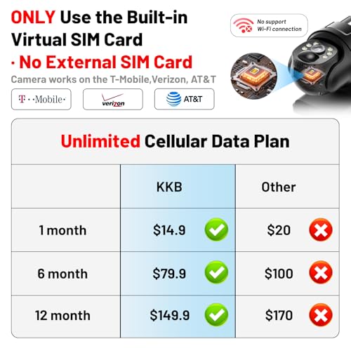 【Unlimited Data Plan – Subscription Required】This cellular security camera includes a non-removable built-in SIM that connects to 4G networks (Verizon, T-Mobile, AT&T). The 4g camera connection provides 300MB of trial data. After the trial period, cellular data can be renewed via the app for $14.9/month, $79.9/6 months, and $149.9/year. Enjoy unlimited viewing anytime, anywhere.