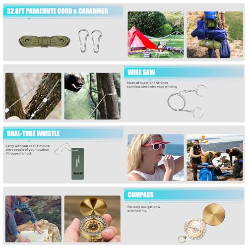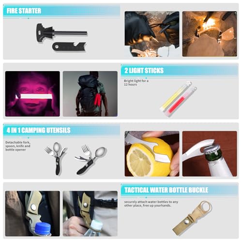 【High Quality Survival Gear for Any Emergency】This is a multiple survival tool kit that can meet your different needs outdoor. A knife and wire saw for cutting wood; 4 in 1 Folding Shovel for clearing rubble; parachute cord & emergency tent to assist you in creating a makeshift shelter; emergency blanket for retain 90% of body heat. It also contains mutiple tools: folding pliers, flashlight, flint stone and scraper, compass etc. Great gifts for men like outdoor activities.