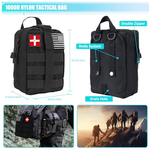 This is a comprehensive survival kit and first aid kit with molle tactical pouch, contains 236pcs professional practical tactical survival tools and essential first aid supplies, full featured, that can serve as car first aid kit, emergency kit, first aid kit camping. Designed with a focus on high quality, convenience and versatility, this emergency kit is perfect for men, women, teen boys, and kids who enjoy wildness adventure, camping, hiking, and car travel.Unique Christmas birthday Thanksgiving Day Anniversary Day gifts for men dad husband him women.