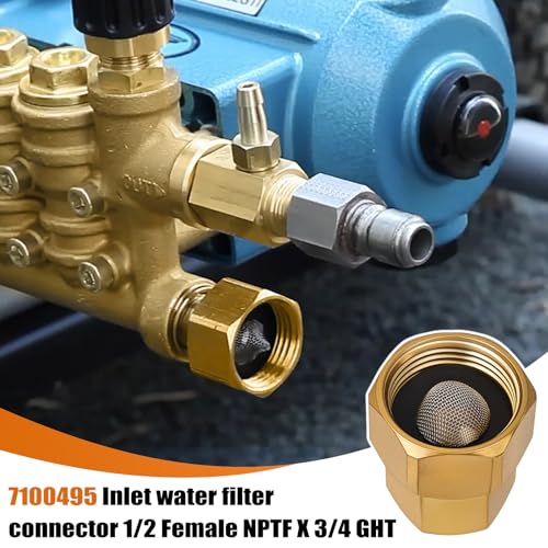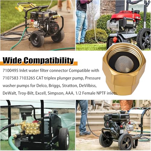 Wide Compatibility: 7100495 Inlet water filter connector Compatible with 7107583 7103265 CAT triplex plunger pump, Pressure washer pumps for Delco, Briggs, Stratton, DeVilbiss, DeWalt, Troy-Bilt, Excell, Simpson, AAA, 1/2 Female NPTF inlets.
