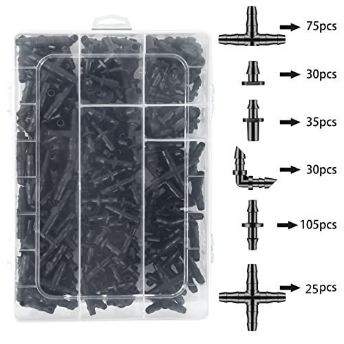 300 Pcs Barbed Connectors Drip Irrigation Fittings Kit, 1/4″ Drip Irrigation Kit for Garden Flower Pot Greenhouse Lawn (Straight Barbs,Single Barbs,Tees,Elbows,End Plug,4-Way Coupling)
