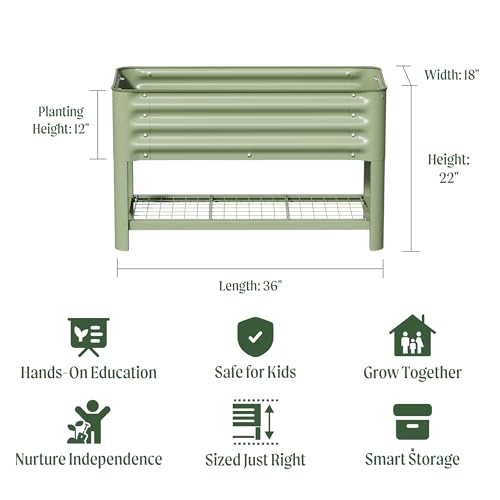 Elevated Raised Garden Bed for Kids, 16″(W) x 36″ (L) x 22″(H) Outdoor Planters Box with Legs & Storage Rack, Solid & Safe Raised Beds for Gardening Herbs Vegetables Flowers, Olive Green