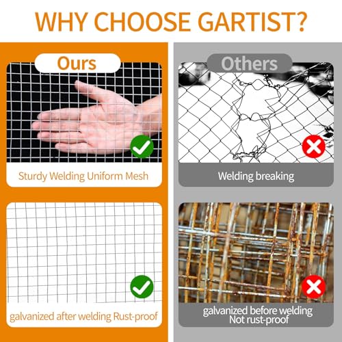Material upgrade: Gartist hardware cloth adopts a double galvanizing process, which first uses galvanized steel wire to weld into a wire mesh, and then hot-dip galvanizing the mesh. This process improves the corrosion resistance of the wire mesh roll, making it waterproof and rust resistant, sturdy and durable, long-term outdoor use is no problem.