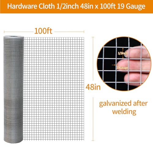 Hot-Dip galvanized after Welding Chicken Wire Fencing,1/2inch 19Ga 48″x100′ Hardware Cloth, Raised Garden Bed Supports Wire Mesh Roll, galvanized Wire Mesh Fence Prevent Snake, Raccoons, Foxes