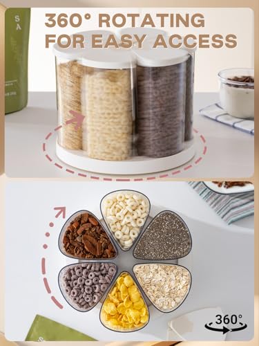 LivLab Mker 5-10 lbs Rice Dispenser – Rotating Cereal dispenser countertop for Pantry – Small Food Storage Containers with Lids, BPA-Free PET Grain Canister Sets 6 Grids, for Oats, Corn Flakes, flour