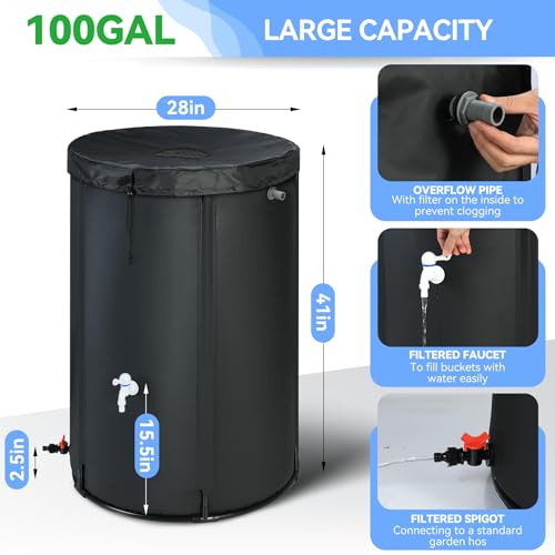 Large Capacity & Efficient Water Collection: The upgraded 100-gallon rain barrel offers ample water storage for gardening, cleaning, and emergencies. Its enhanced internal frame helps the barrel maintain full capacity without collapsing under heavy water pressure