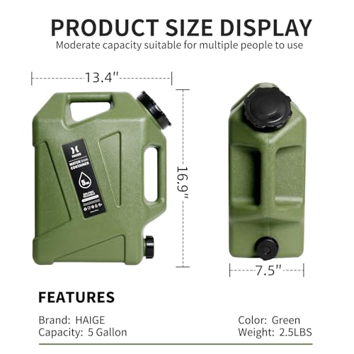 HAIGE 5 Gallon Water Jug with Spigot, BPA-Free Portable Water Container for Camping Picnic Hiking Emergency Water Storage, Green 5 Gal Water Tank with Handle & Lid