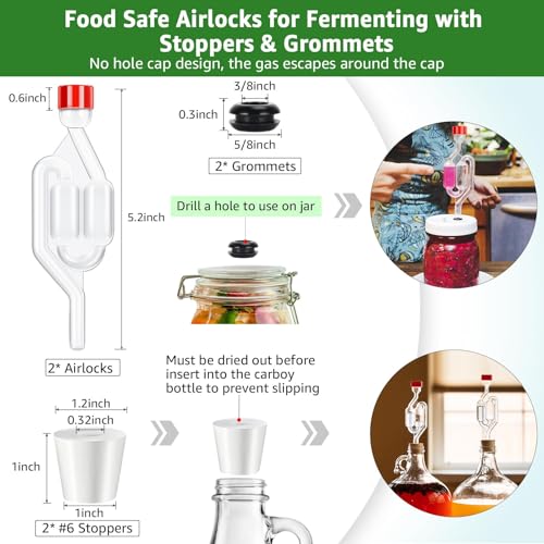 【Complete Airlock for Fermenting Set】The twin bubble s-shape airlocks for fermenting is made of upgraded food grade material, sturdy and durable. The #6 stoppers and grommets are suitable for using these airlocks on both brewing carboy bottle and small mason jars common and other fermentation bucket in daily life. Just fill 1/2 or 1/3 clean water for each bulb into these airlocks for fermenting and insert them into your fermentation jar or carboy to start your fermentation.