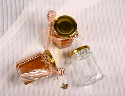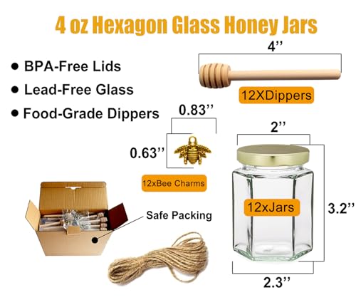 Adabocute 4oz Hexagonal Honey Jars – Glass Honey Jars with Gold Lids, Wooden Dippers, Bee Charms and Jutes – Hexagon Jars for Baby Shower, Wedding and Party Favors, 12 Pack