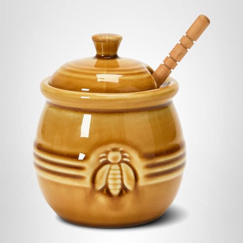 This playful stoneware honey pot features an intricately embossed bee illustration and a classically designed wooden dipper